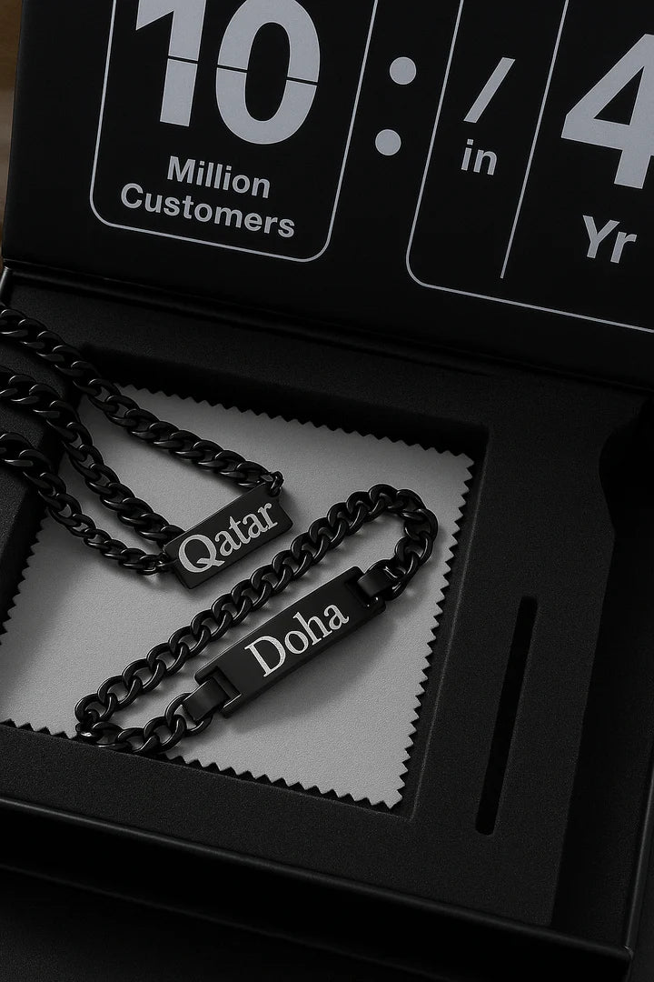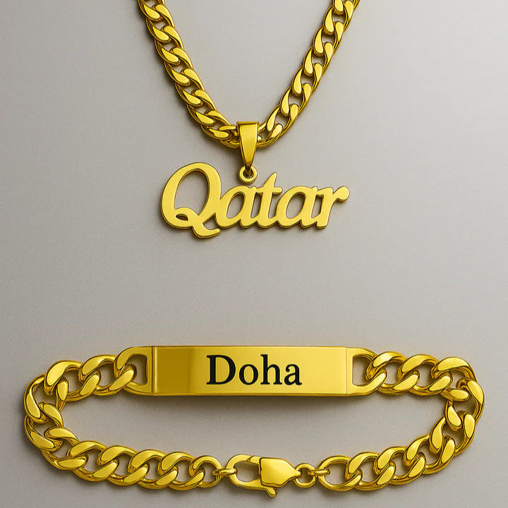 Celebrate your love for Qatar with this beautifully crafted Custom Name Necklace & Bracelet Set featuring elegant engravings like “YOUR NAME” and “YOUR NAME.” Perfectly designed for everyday wear or as a memorable gift, this set symbolizes national pride with a luxurious touch.