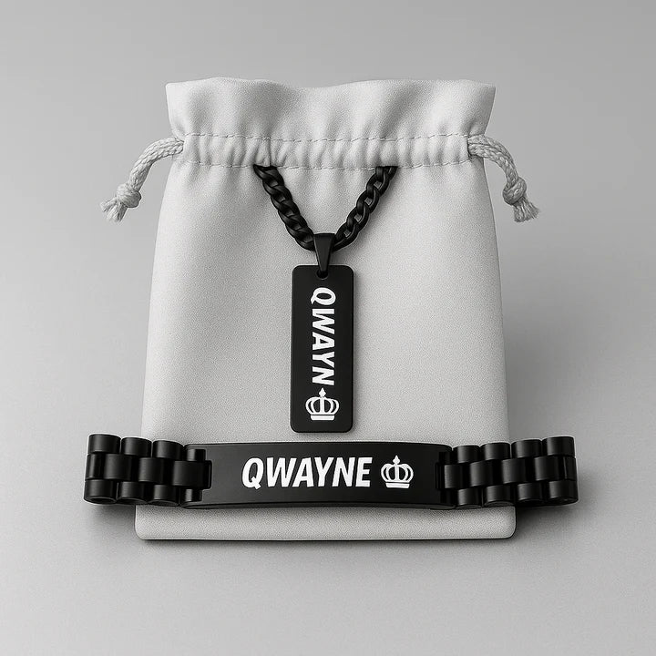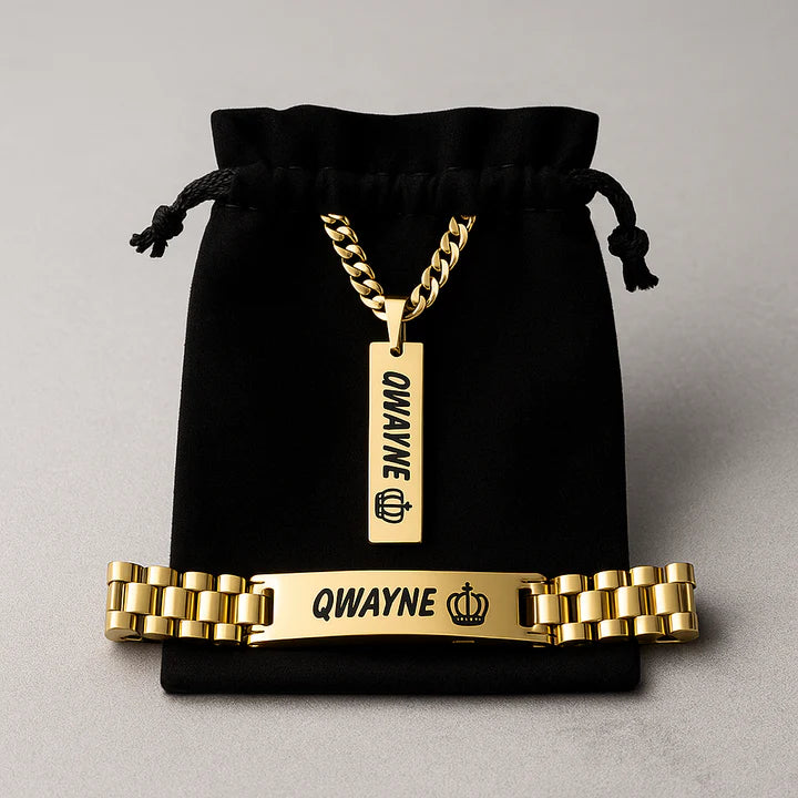 Make a bold statement with our Personalized Bracelet & Pendant Set – a premium jewelry duo designed for the modern man. Featuring a Stainless bracelet and matching pendant, both engraved with the name "YOUR NAME" and crowned with a regal emblem, this set exudes elegance and individuality.