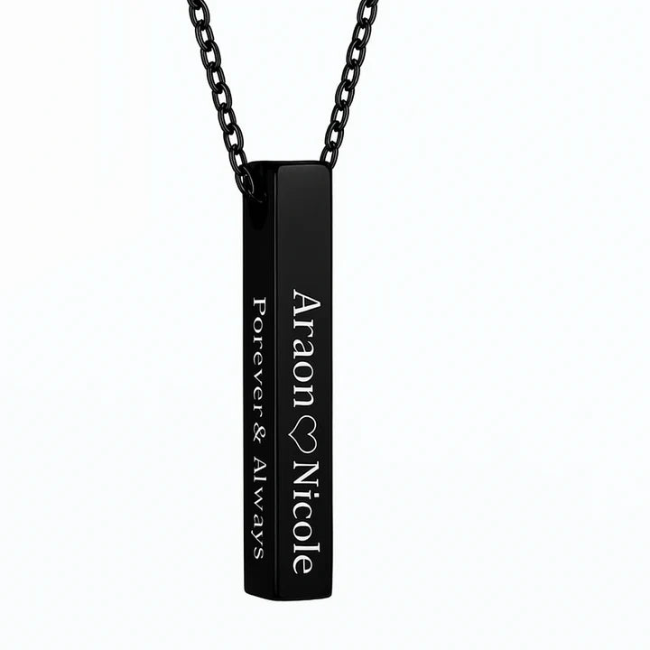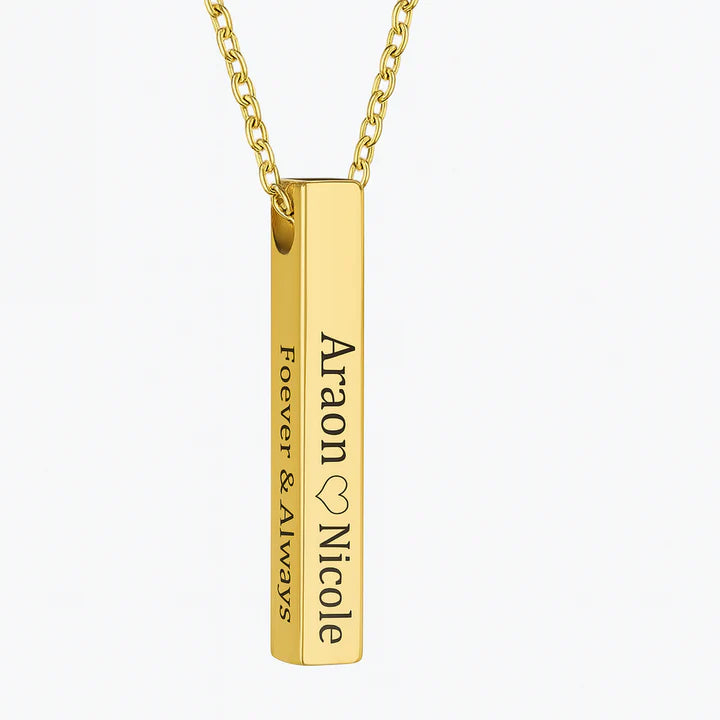 Celebrate your love story with our Custom Engraved Bar Necklace, beautifully personalized with couple names, a heart symbol, and a meaningful message like "Forever & Always." Crafted with a high-quality gold finish, this vertical bar pendant hangs gracefully on a matching chain, creating a timeless and elegant piece perfect for both men and women.