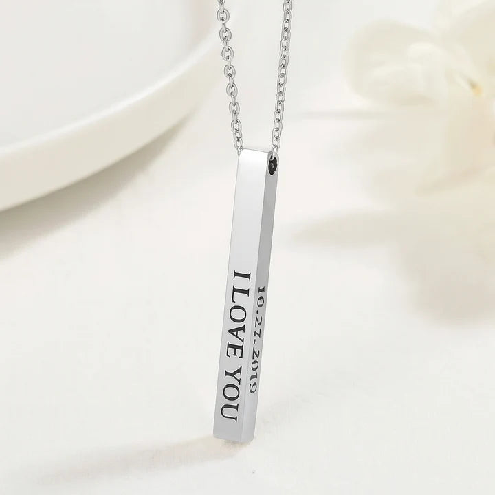 Express your love with timeless elegance through our Custom Silver Engraved Bar Necklace. Featuring the heartfelt message "YOUR NAME" and a memorable date, this personalized vertical pendant is crafted in polished silver and suspended on a delicate yet durable chain. It's the perfect keepsake to celebrate anniversaries, special moments, or simply to say “you mean everything.”