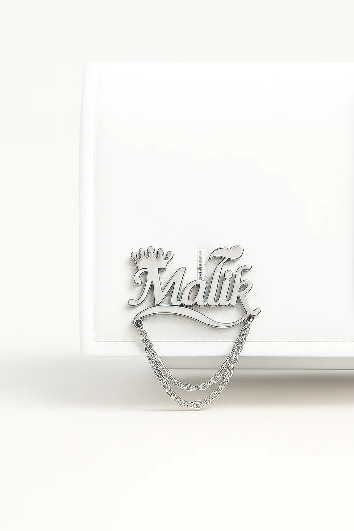 Add a touch of royalty to your wardrobe with our Custom Name Brooch with Crown & Chain – the ultimate statement piece for both men and women. Expertly crafted with a luxurious finish, this personalized name pin features elegant cursive lettering topped with a regal crown and stylish dual-chain detailing for added sophistication.
