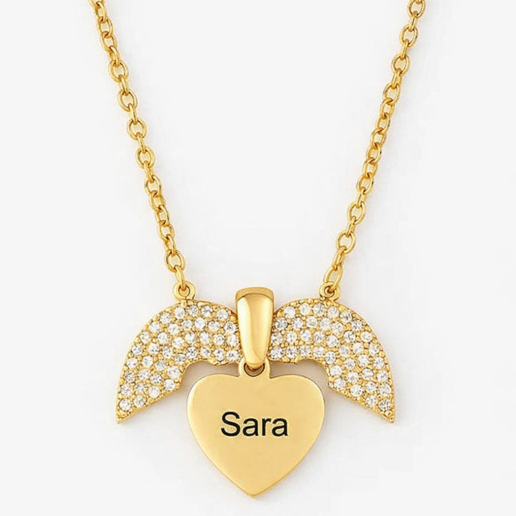 Keep your loved one close to your heart with our Custom Name Angel Wing Necklace, a timeless and elegant piece designed to symbolize love, protection, and connection. Featuring a radiant gold heart pendant engraved with your chosen name and embraced by two angel wings adorned with sparkling cubic zirconia, this necklace is the perfect gift for someone special—or yourself.