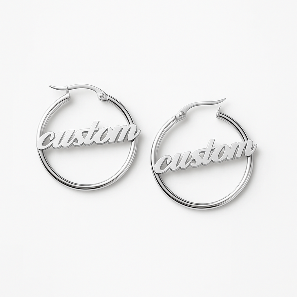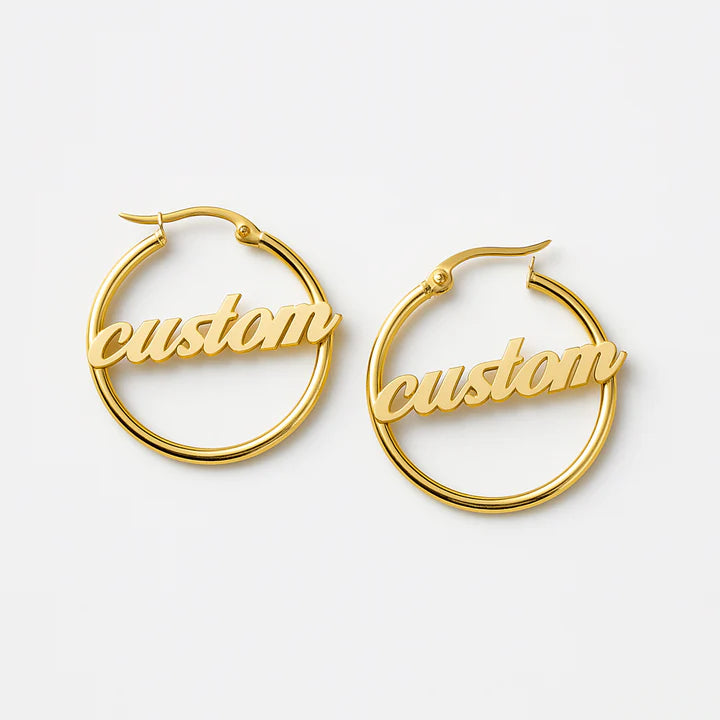 Turn heads with our Custom Name Hoop Earrings, the perfect blend of personalization and fashion-forward flair. These bold, round statement earrings are crafted from high-quality 24CT gold-plated stainless steel, featuring your custom name or word in a sleek, modern font that adds a unique and personal touch to any outfit.