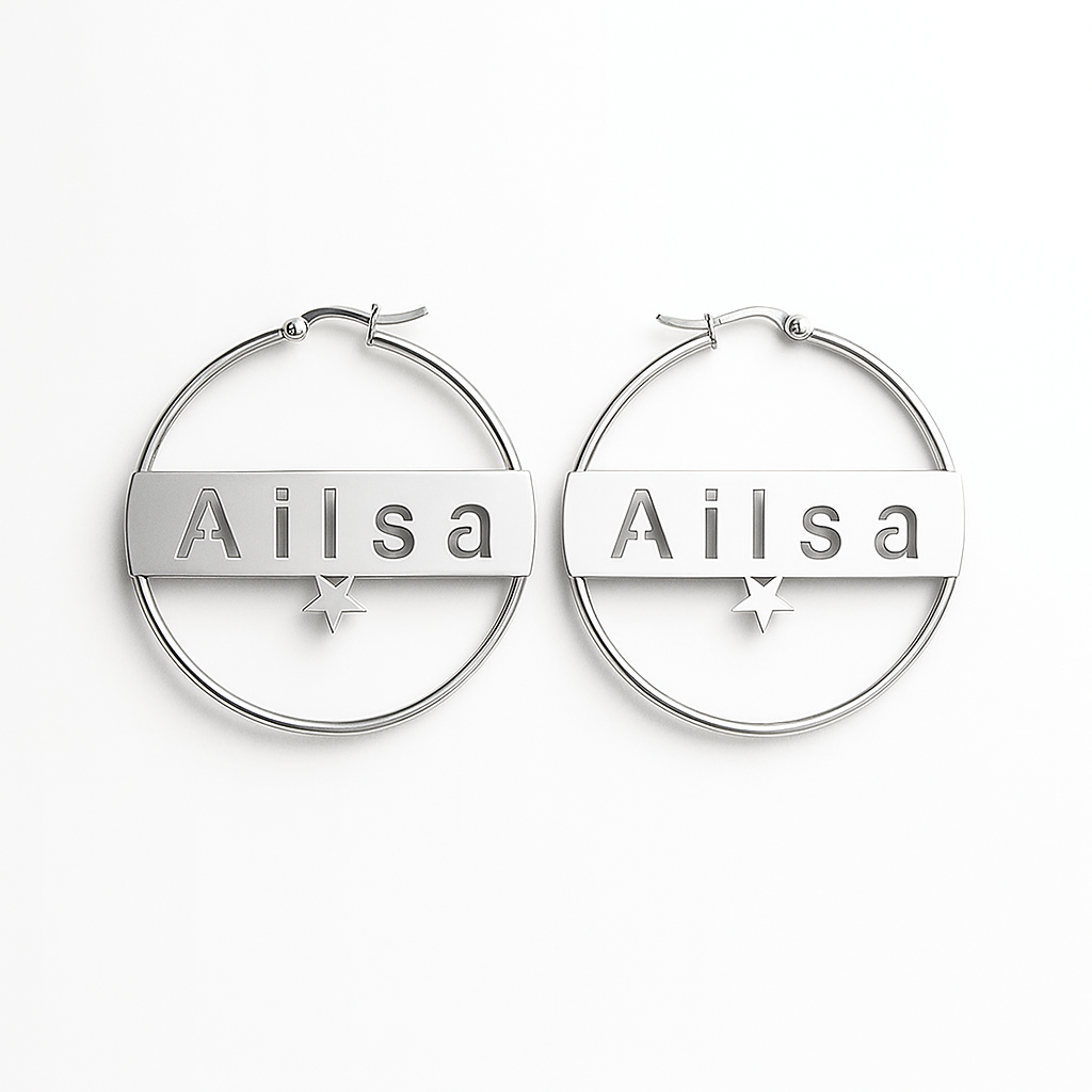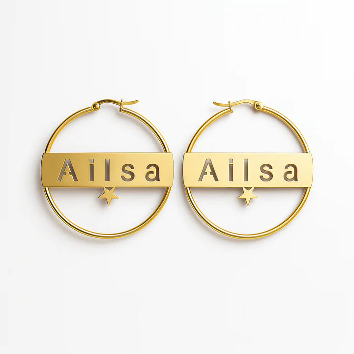 Shine bright with our Custom Star Name Hoop Earrings, designed to make your style truly personal and bold. These stunning 24CT gold plated hoop earrings feature a sleek cutout name plate with a charming star accent, combining elegance and individuality in one powerful statement piece.