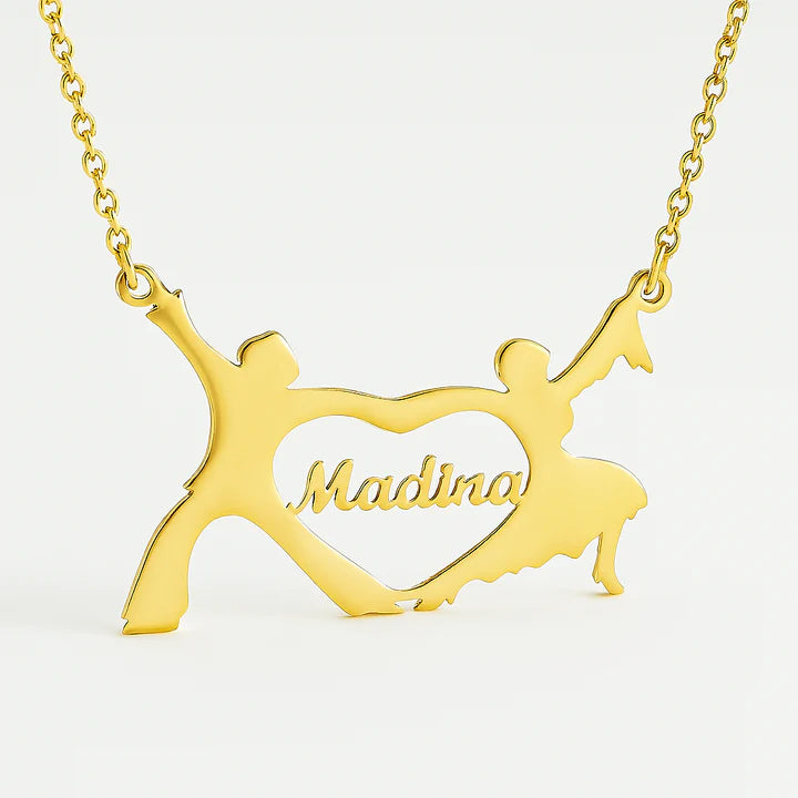 Celebrate the rhythm of love and passion with this Custom Dance Couple Name Necklace. Beautifully crafted in a gold finish, this unique pendant features an elegant dancing couple forming a heart around your personalized name — a perfect symbol of connection, movement, and romance.