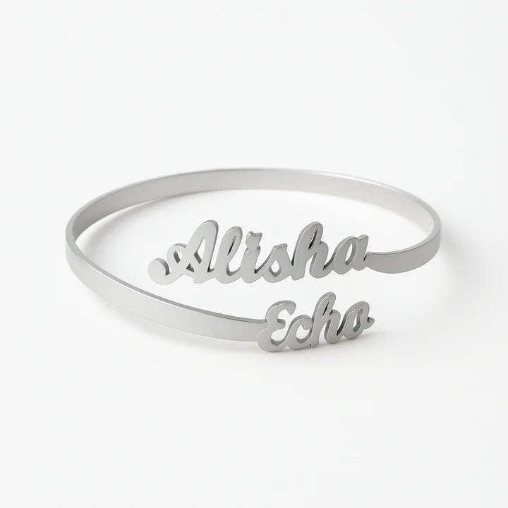 Celebrate meaningful connections with this stunning custom double-name gold bracelet, uniquely engraved with the names Alisha and Echo. Designed in a flowing script and crafted from high-quality gold-plated stainless steel, this bracelet beautifully represents love, friendship, or family bonds.