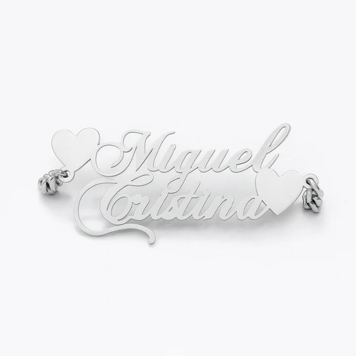 Make a bold and meaningful statement with our Custom Gold and Silver Double Name Necklace – a luxurious piece designed to celebrate love, connection, and individuality. Crafted in radiant gold with elegant script and two heart accents, this necklace beautifully displays two names of your choice in a flowing, romantic design.