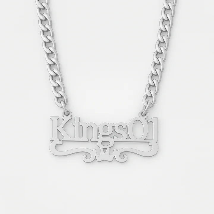 Crafted from durable stainless steel and finished in brilliant plating, this necklace features the standout “Kings01” nameplate and intricate scrollwork below. Whether you're gifting greatness or claiming your throne, this piece brings luxury to your everyday look.