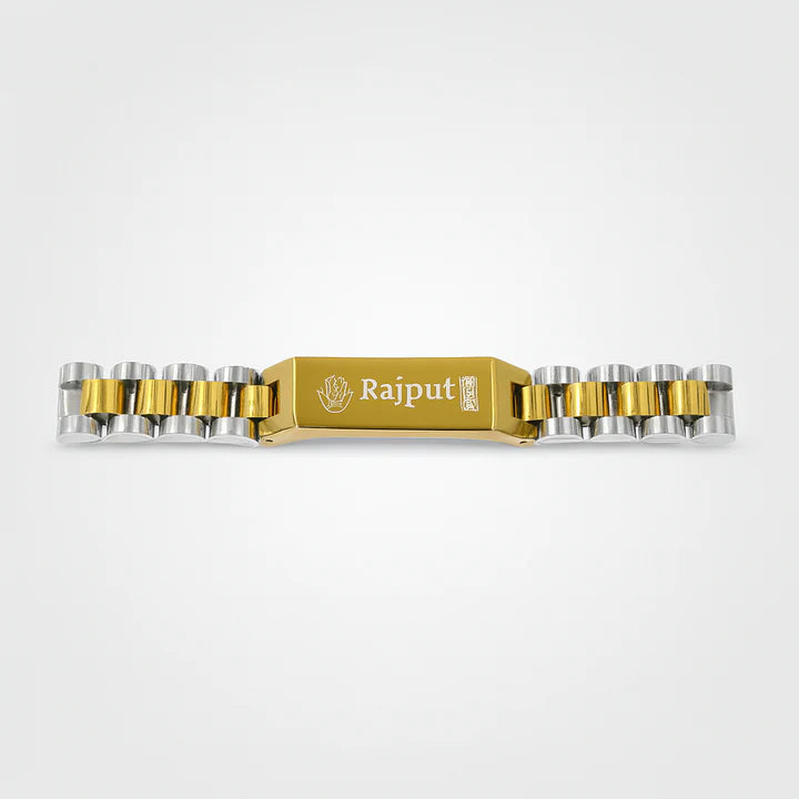Showcase your pride and heritage with this stunning Rajput custom bracelet, crafted from high-quality gold and silver-toned stainless steel. Featuring a laser-engraved Rajput name and emblem, this bracelet symbolizes strength, honor, and timeless tradition.