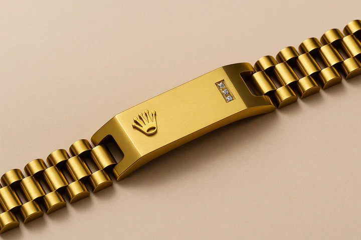 Unleash timeless elegance with this 24K gold-plated luxury bracelet, designed in the spirit of Rolex craftsmanship. Featuring a bold brushed gold finish, signature crown emblem, and glistening diamond accents, this bracelet speaks power, prestige, and impeccable taste.