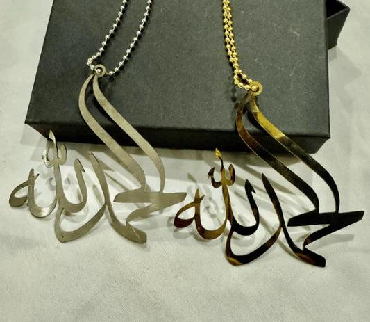 Celebrate faith and elegance with this beautifully designed “Muhammad ﷺ” Islamic Calligraphy Necklace. Crafted with fine detailing and finished in a luxurious gold tone, this pendant represents love, respect, and devotion.