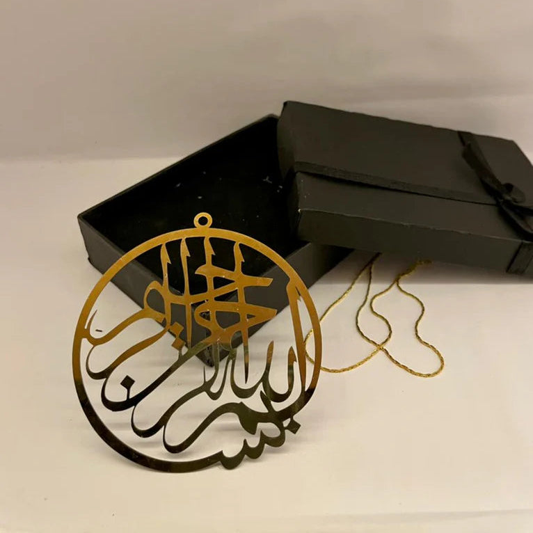 Enhance your space with the beauty and blessings of faith through this Bismillah Islamic Calligraphy Hanging. Crafted with elegant Arabic calligraphy and finished in a rich gold tone, this piece symbolizes positivity, protection, and spirituality.
