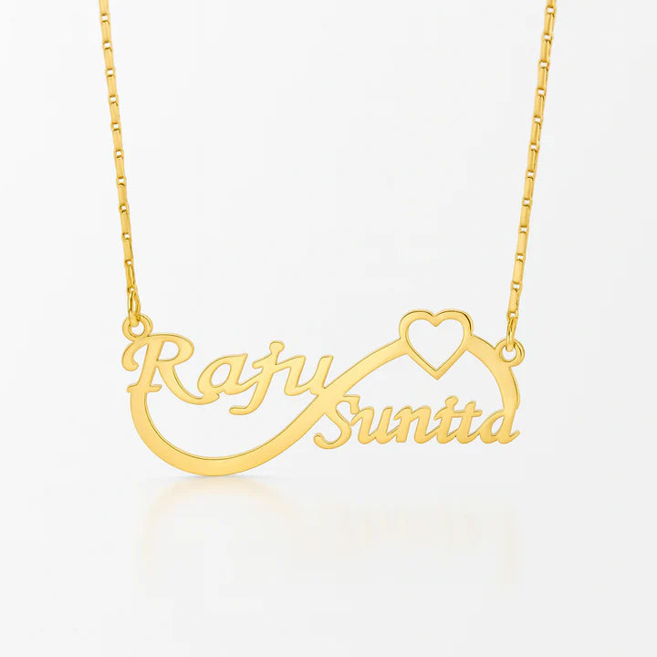 Celebrate eternal love with this Personalized Infinity Name Necklace for Couples, beautifully crafted in luxurious gold or silver-plated stainless steel. Featuring two custom names connected by an infinity symbol and a romantic heart detail, this necklace is a perfect expression of forever and always.