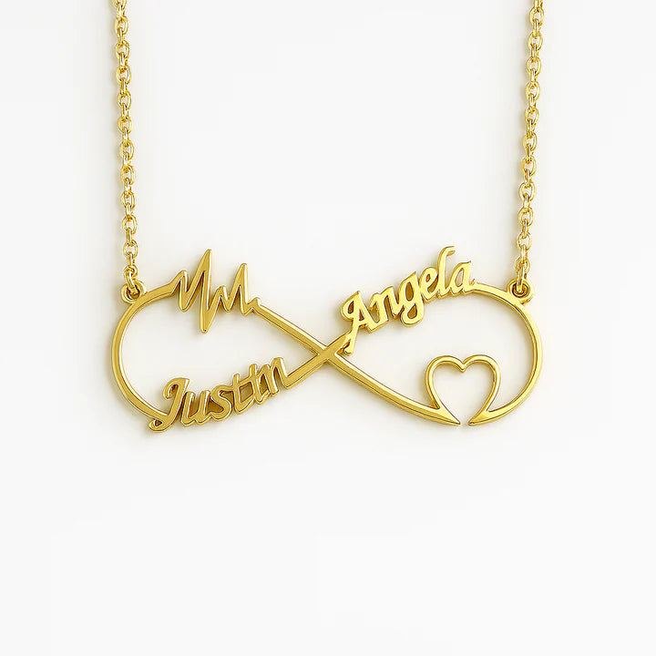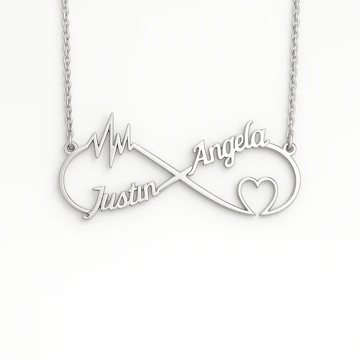 Celebrate everlasting love with our Custom Infinity Heartbeat Name Necklace, a stunning symbol of connection, devotion, and romance. This elegant piece features two personalized names intertwined with an infinity loop, accented by a heartbeat line and heart design — the perfect gift to express your forever bond.