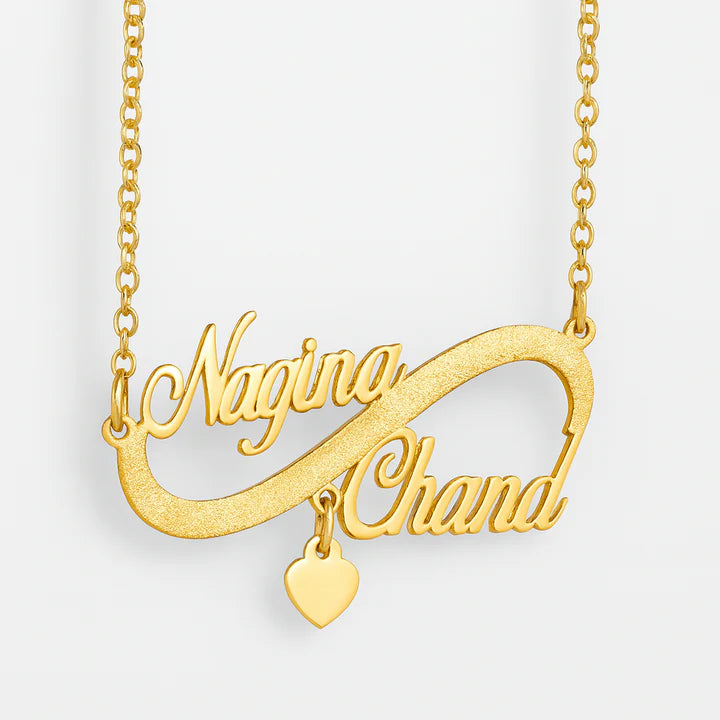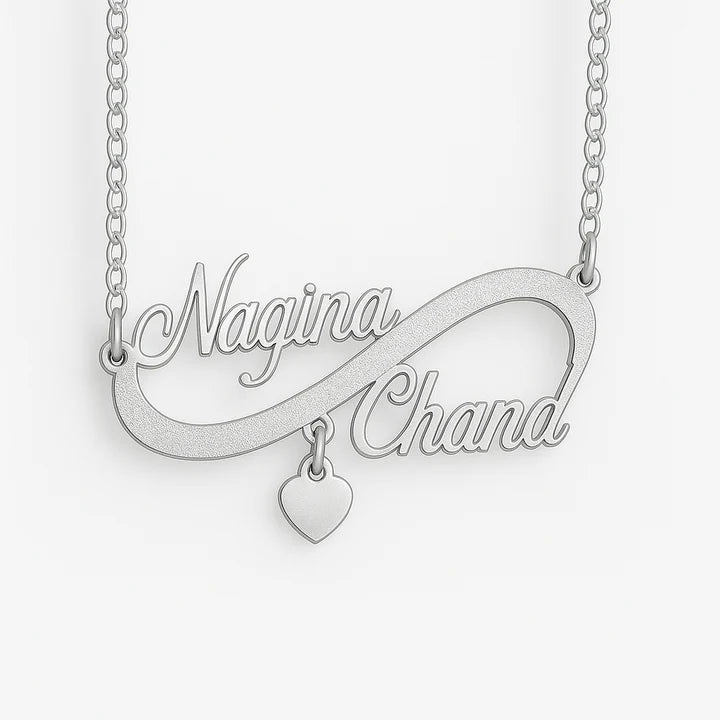Celebrate unbreakable bonds with our Custom Infinity Name Necklace, a stunning piece of personalized jewelry crafted to symbolize eternal love and connection. This elegant design features two names gracefully woven into an infinity symbol, accented with a charming heart pendant for a romantic and meaningful touch.