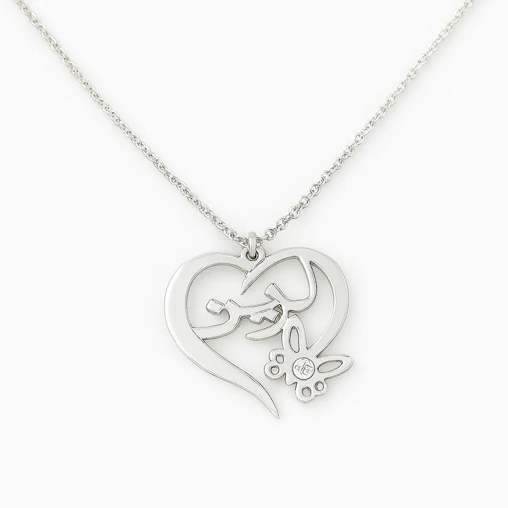 Embrace elegance and cultural charm with our Arabic Name Heart Necklace, beautifully designed in a heart shape with a delicate butterfly accent featuring a sparkling stone. Crafted in a luxurious gold finish, this personalized pendant adds a meaningful and stylish touch—perfect for everyday wear or gifting to someone special.
