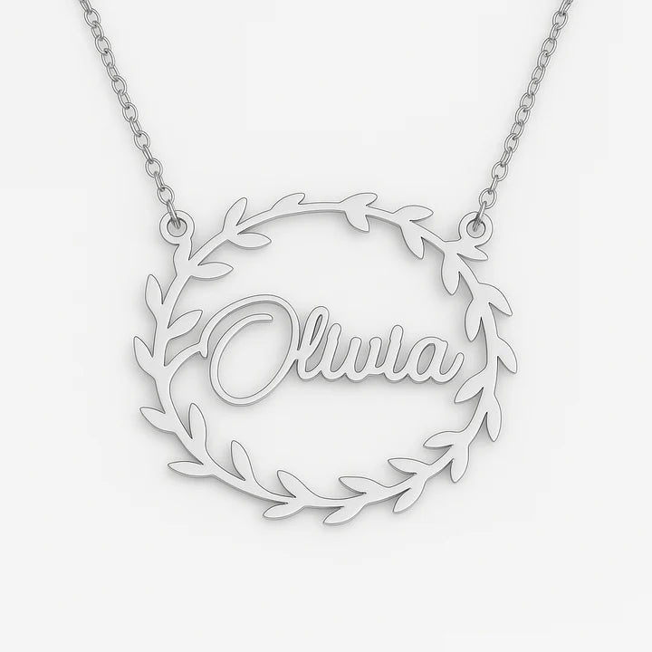 Elevate your style with our Custom Gold Name Necklace, beautifully designed with a delicate leaf wreath encircling your personalized name in elegant script. This charming pendant, crafted in a polished gold finish, combines nature-inspired beauty with a personal touch—making it a perfect gift for birthdays, celebrations, or everyday elegance.