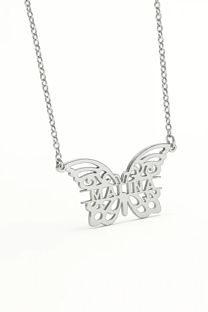 Make a bold yet elegant statement with our Personalized Butterfly Name Necklace, expertly crafted in a detailed cutout design that blends artistry and personalization. The stunning gold butterfly silhouette is centered with your custom name, creating a graceful and meaningful accessory perfect for daily wear or gifting.
